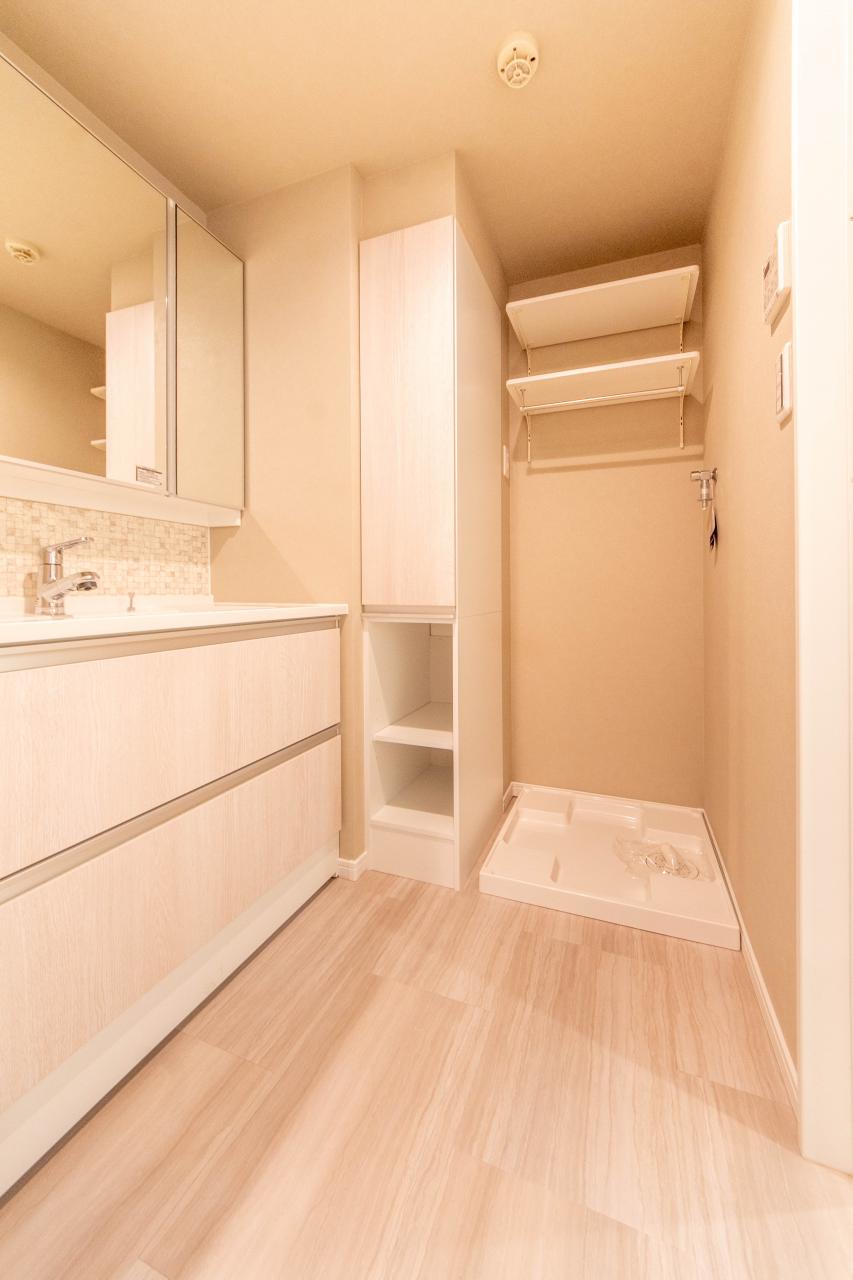 ランドリースペース|キャビネットや可動棚を備えているので洗剤などの日用品もスッキリ収納することが可能です。
