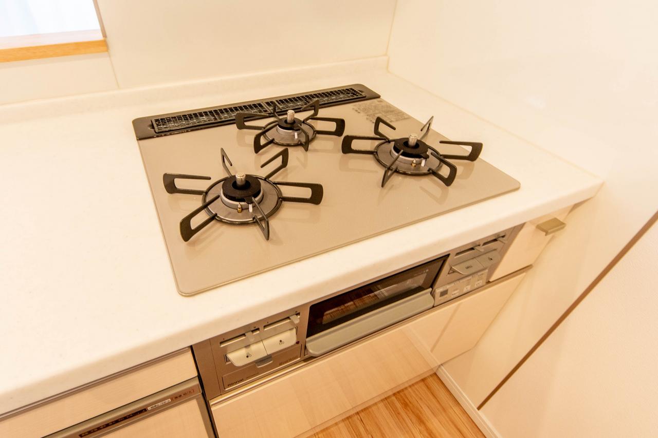 コンロ|フラットなデザインでお手入れもしやすい三口コンロです。