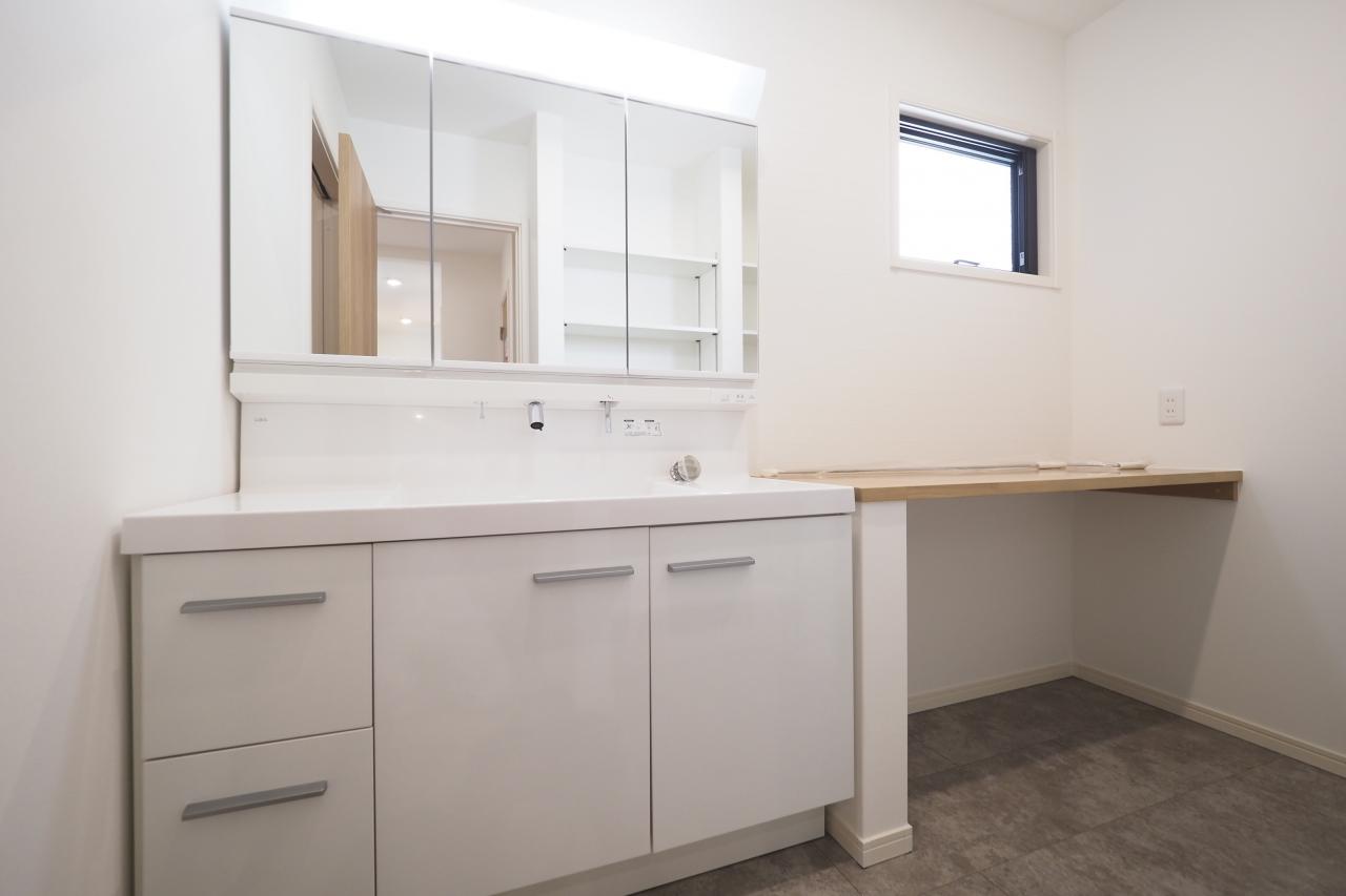 ワイドサイズで2人並んで使える便利な洗面化粧台。