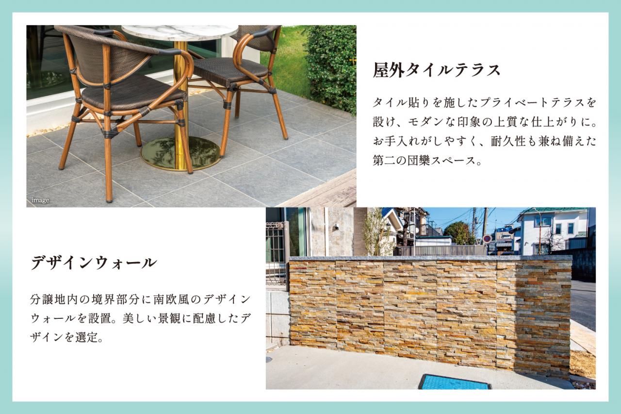 プライベートテラスを採用し、美しい街並みを演出。/隣地との境界にデザインウォールを選定。