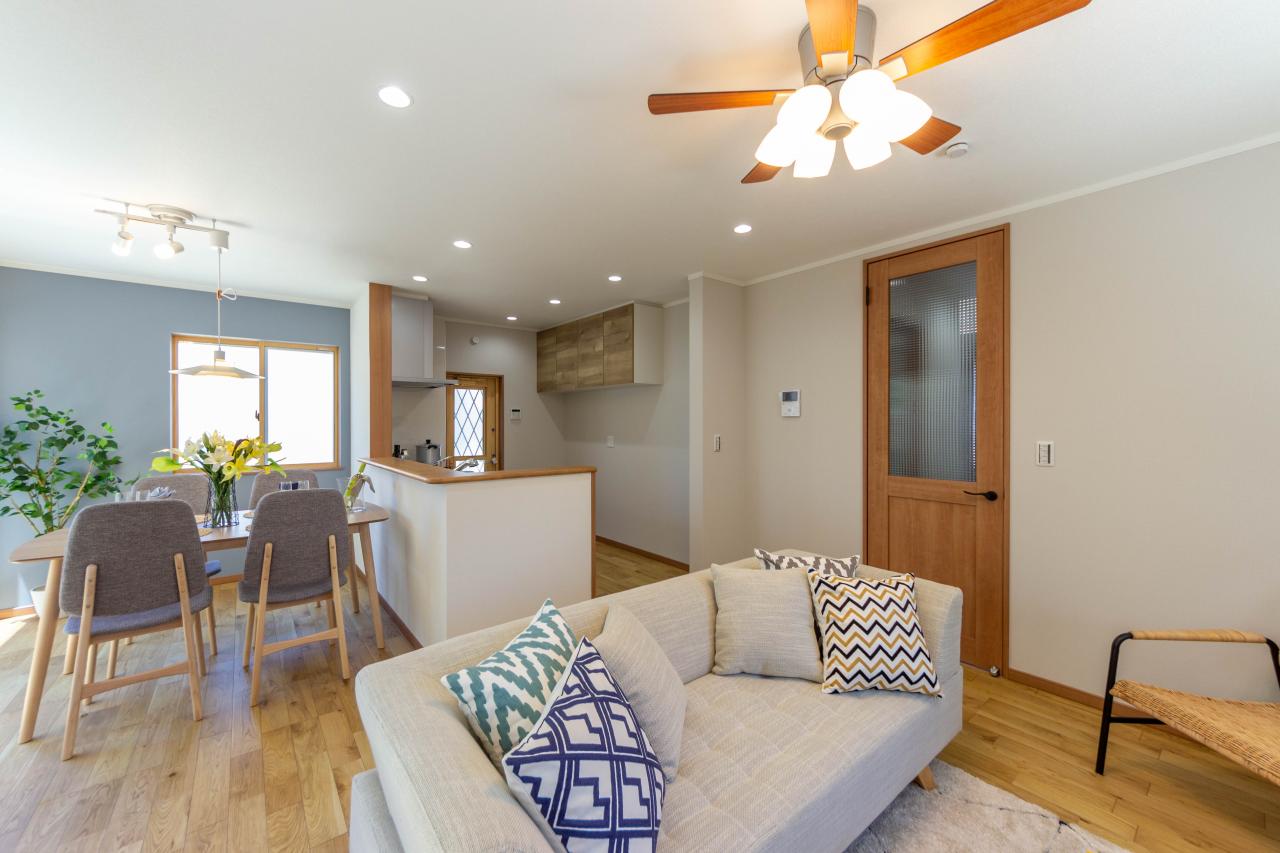 爽やかなアクセントクロスで、温かみのある北欧風のリビングに。リビング全体を見渡せる対面式キッチン採用。/建築プラン例(内観同仕様)/建物面積89.43m2/建物価格2150万円