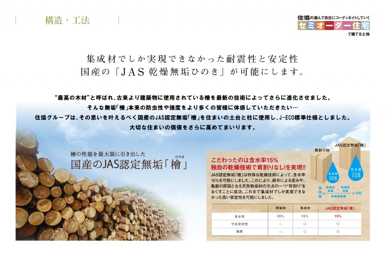■主要構造材(柱、土台、梁)には耐久性に優れた檜JAS乾燥国産無垢檜(ひのき)を使用