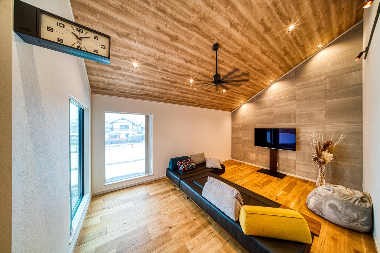 デザイン性と実用性を兼ね備えたモダンスタイル。木目調のクロス、シーリングファン、エコカラットがハイグレードでスタイリッシュな憩いの雰囲気を演出/建築プラン例(内観同仕様)/建物価格2740万円/建物面積118.41m2