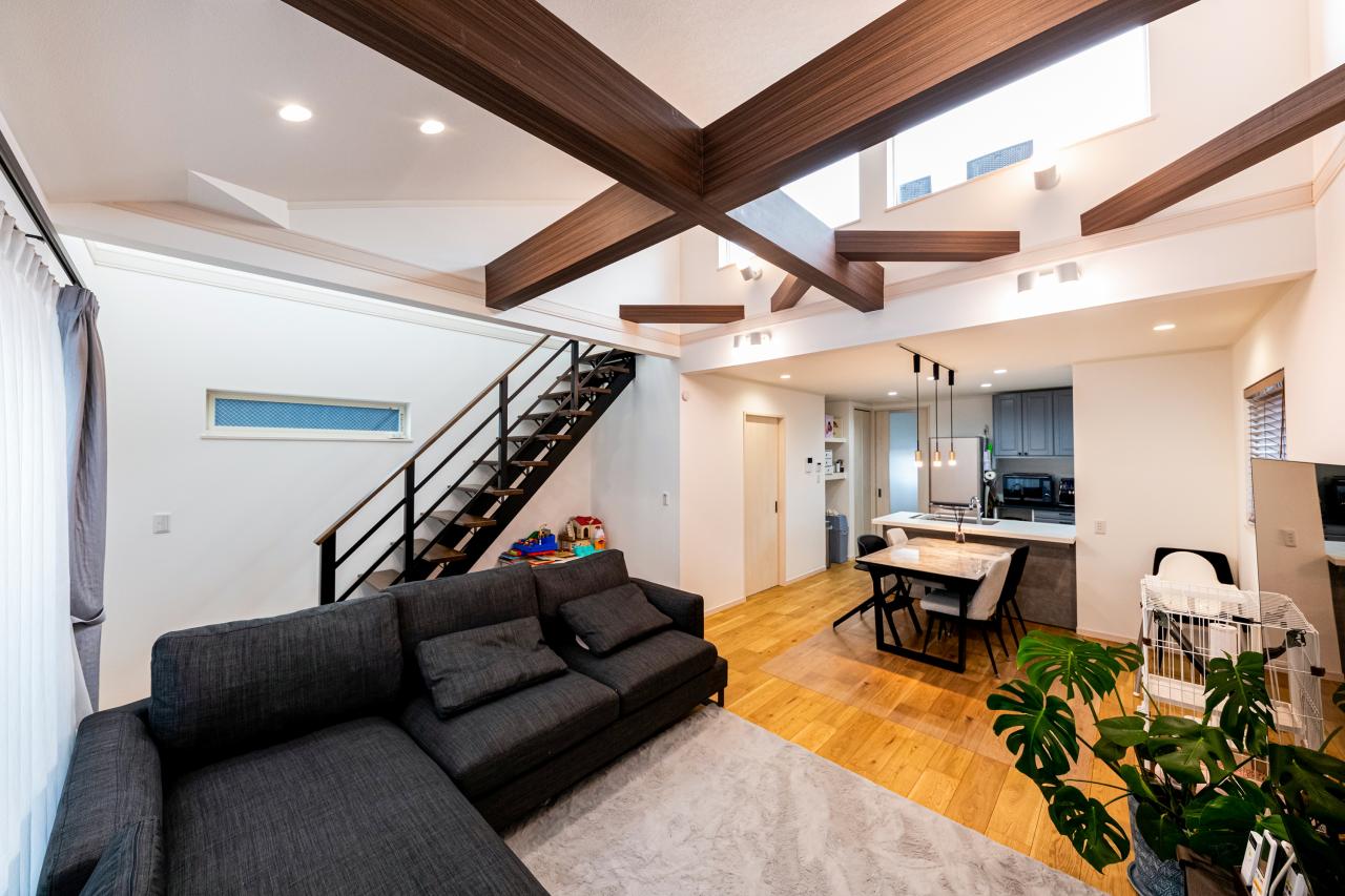 勾配天井とスケルトン階段が開放感により拍車をかける心地よい寛ぎの家。大きな高窓からは暖かい日差しが届く。化粧梁とスポットライトが瀟洒/建築プラン例(内観同仕様)/建物価格2300万円/建物面積97.50m2