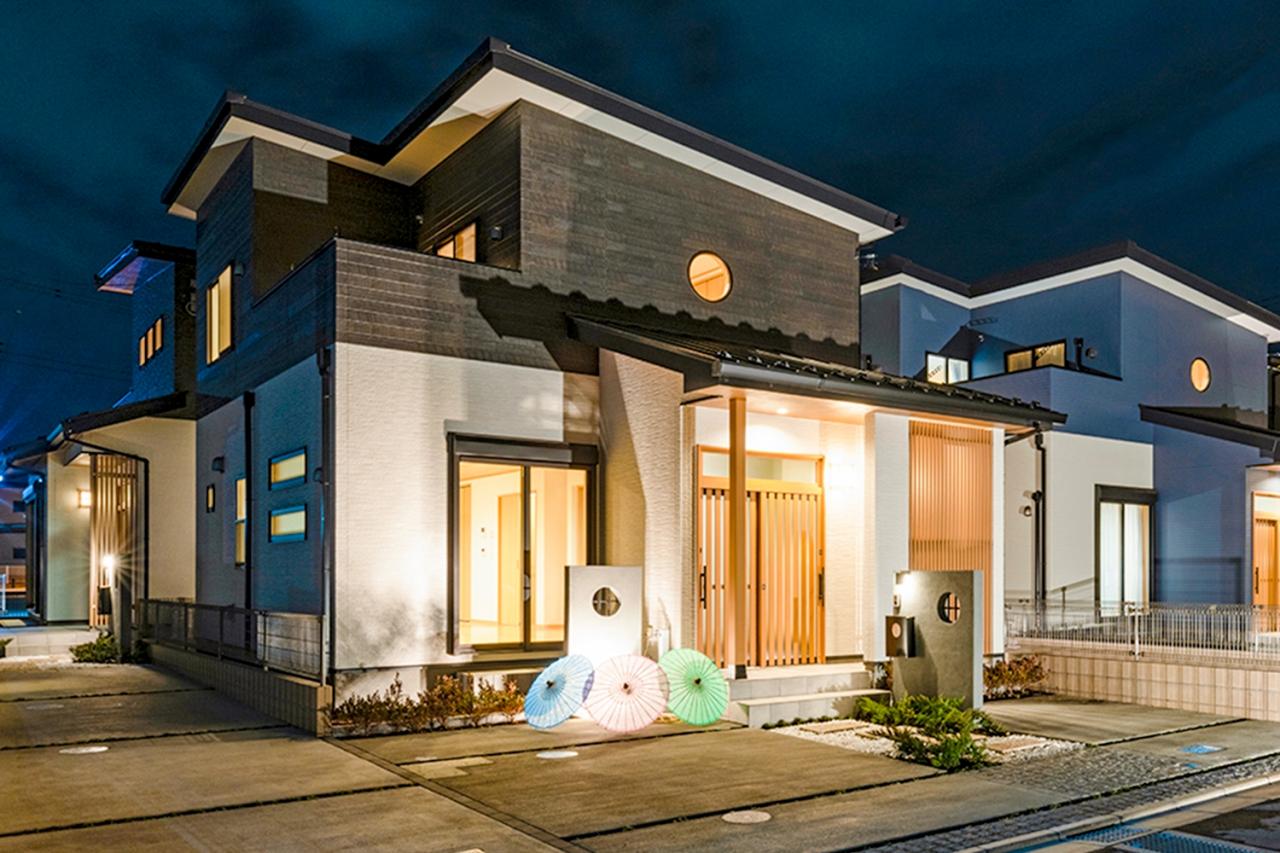 黒の木目調が織りなす重厚な佇まい。 洗練されたダークトーンの質感が夕暮れの街並みに美しく映える、デザイン性の高いモダン邸宅。