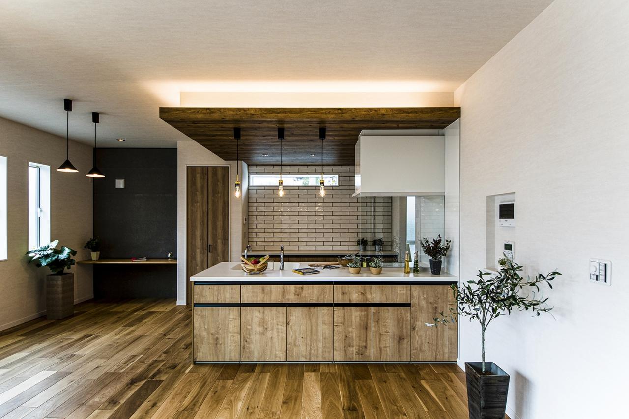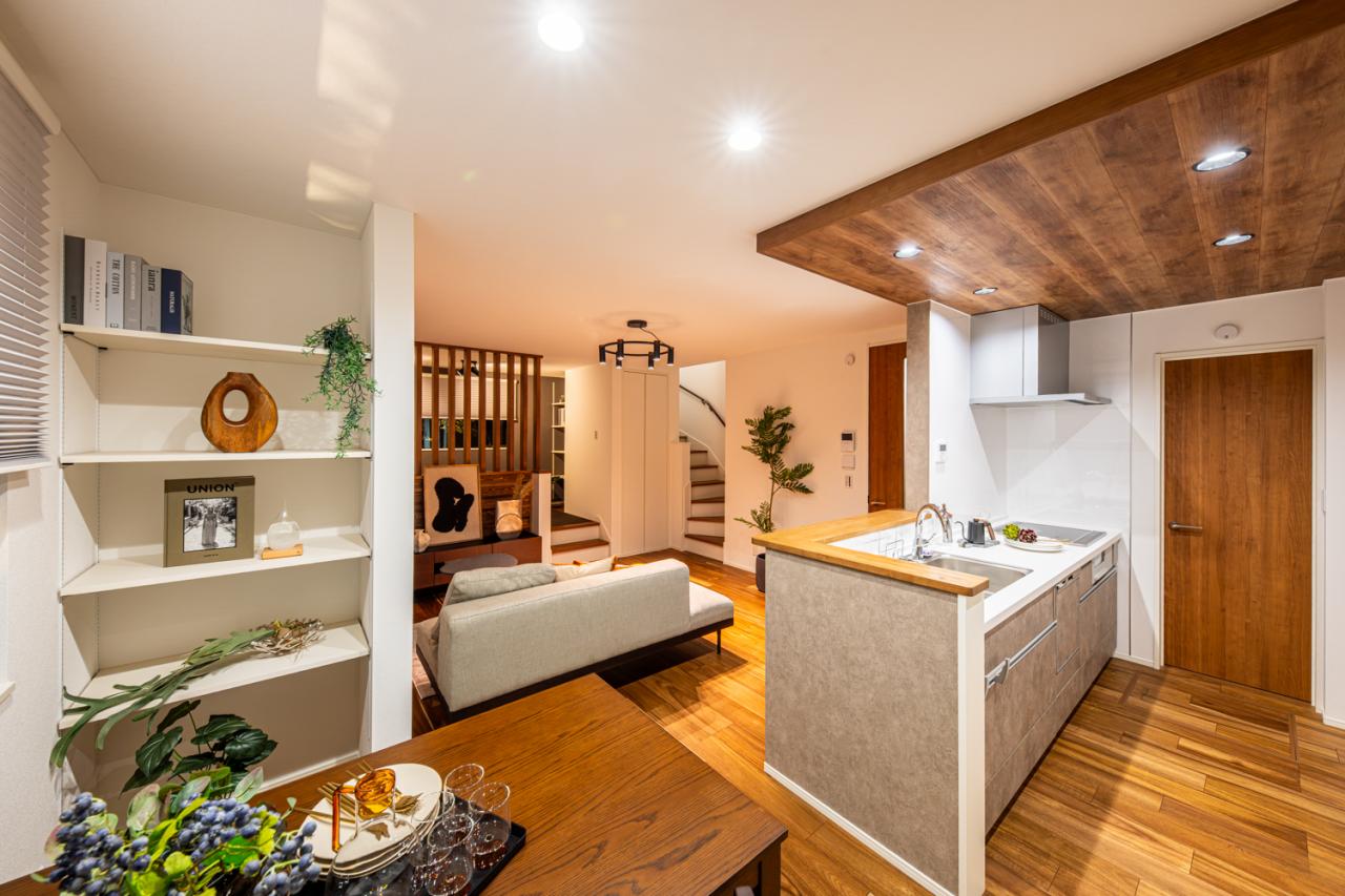 木目調の天井と柔らかな照明が包み込む、上質な寛ぎ空間。自由設計ならではの遊び心と機能美が共存する家。