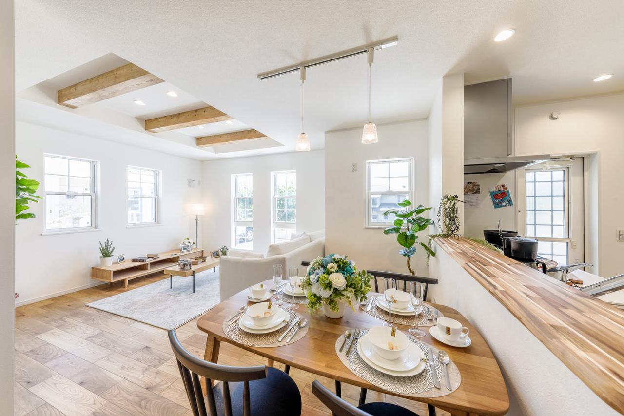 木の温もりを感じる化粧梁と、白を基調とした洗練の空間。自由設計で叶える、カフェのような心地よいLDK。