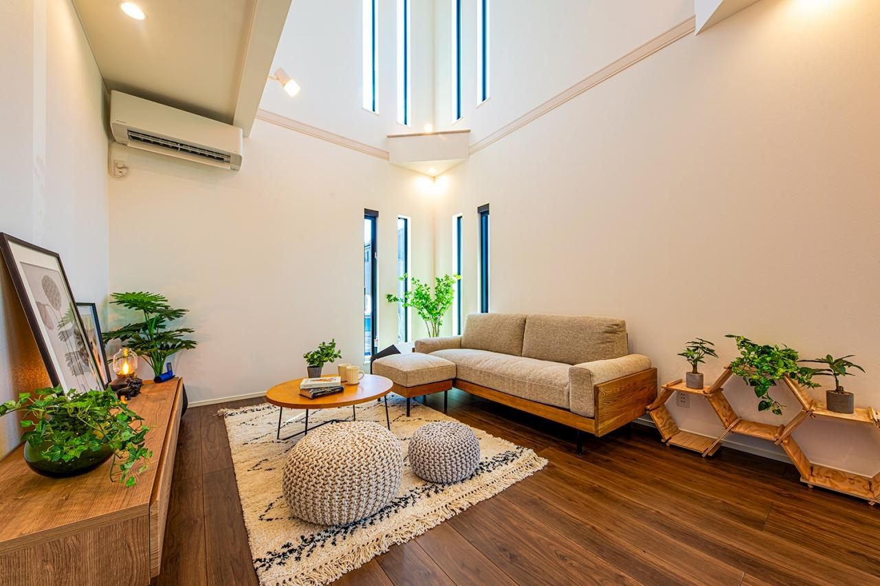 天井高を活かしたダイナミックな吹き抜け空間。スリット窓から光が降り注ぐ、開放感に満ちたリビング。