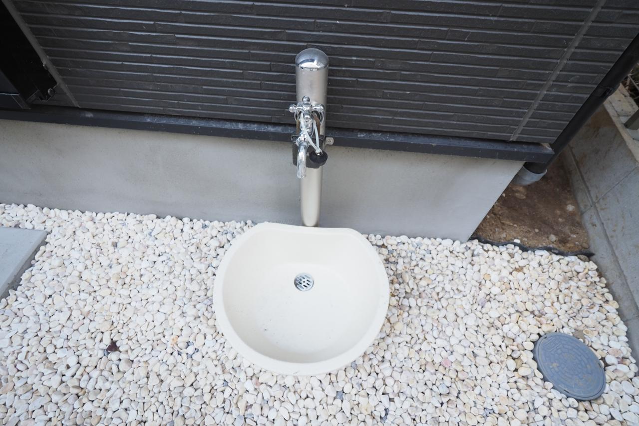 スタイリッシュな外水道。洗車や植栽への水やりに便利です。