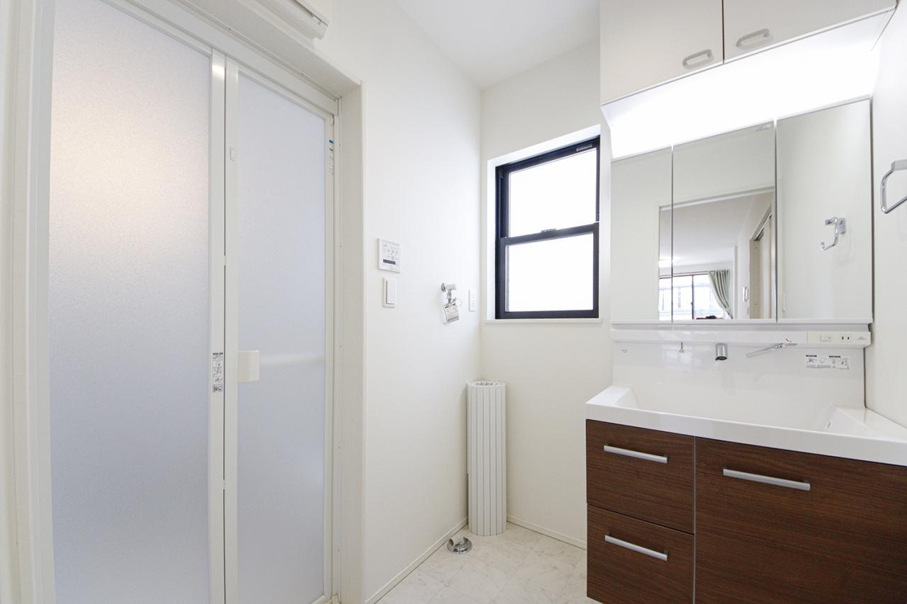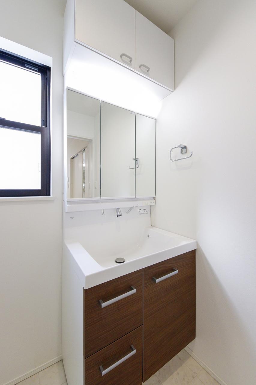 【シャンプードレッサー・水回り設備も非常に綺麗にお使いです】白を基調にしたとても清潔感のあるサニタリールーム!三面鏡付きの洗面台が備わり、毎日の身支度にもとっても便利!