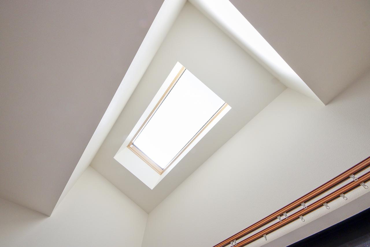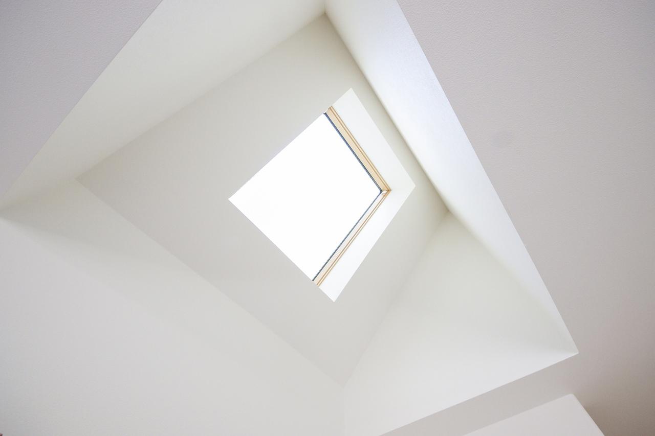 【開放的なトップライト】外からの視線を気にせず、日中の室内を明るく保てる天窓付。部屋全体を均一に照らすため、影がやわらかく空間が広く感じられます