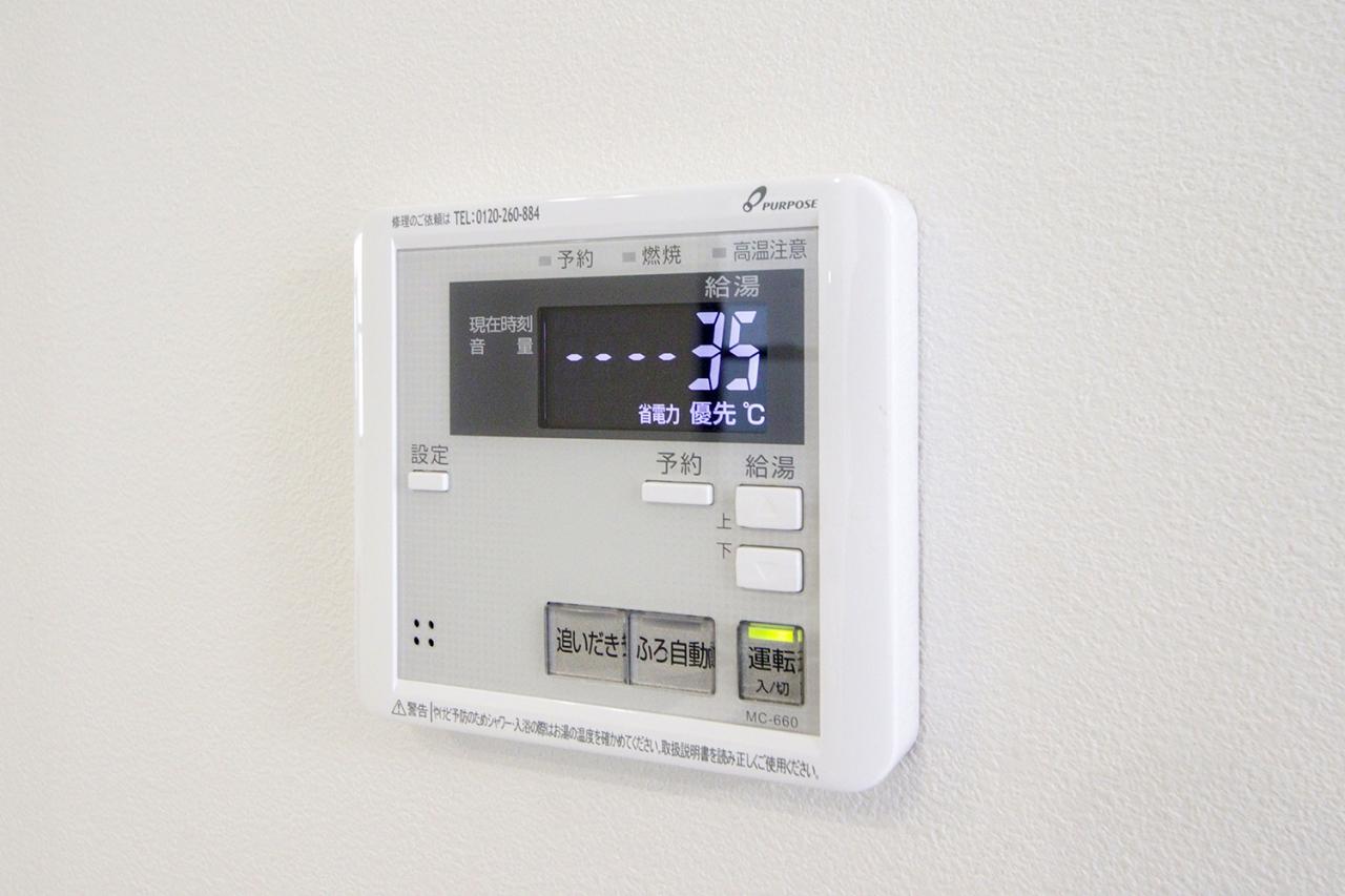 キッチンからスイッチで簡単操作可能な、オートバス機能付の給湯機パネル。経済的な追い焚き機能も備わります。おなじみのメロディで「お風呂が沸きました♪」と知らせてくれる優れものです