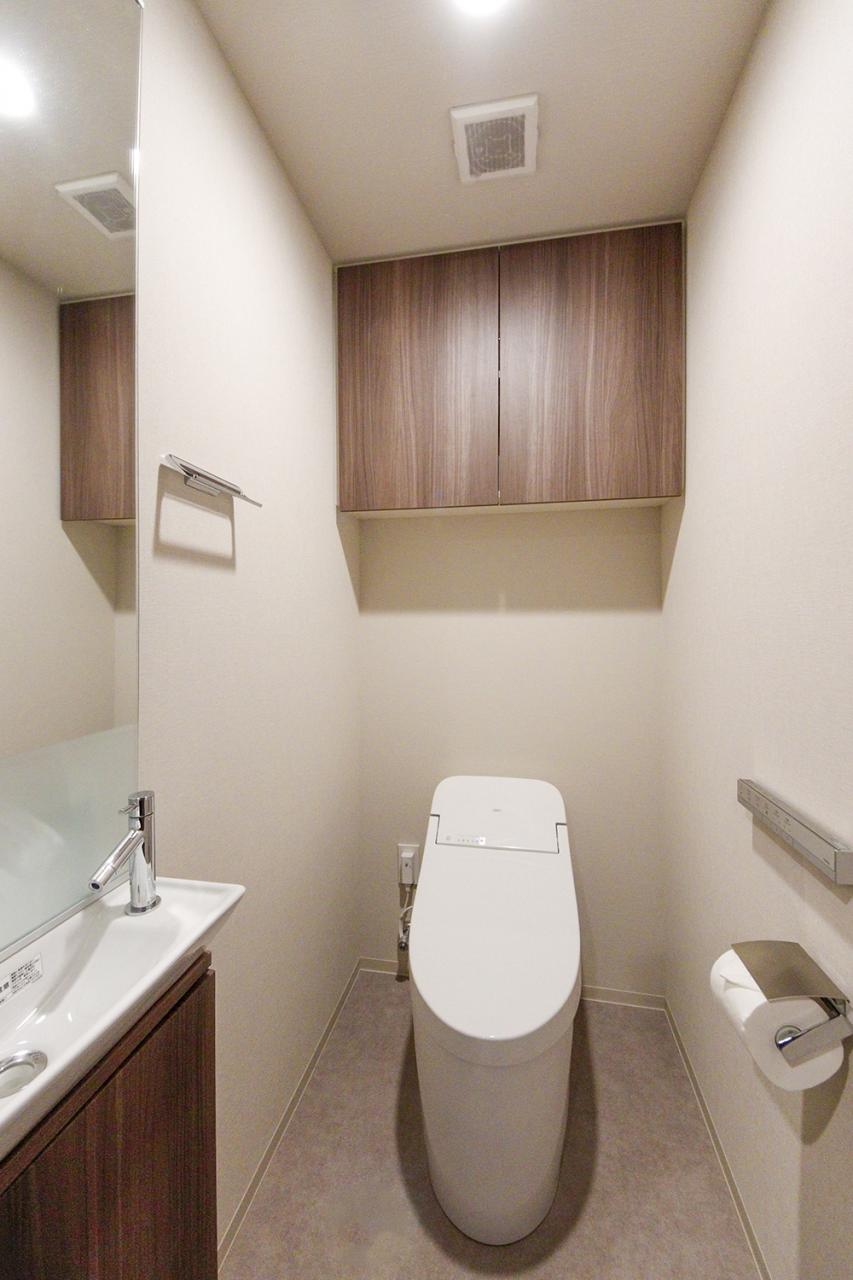 □ウオシュレットトイレ完備□ タンクレスでスタイリッシュなトイレ。上部吊戸棚やミラー付き手洗いを備え使い勝手にも配慮された設計です