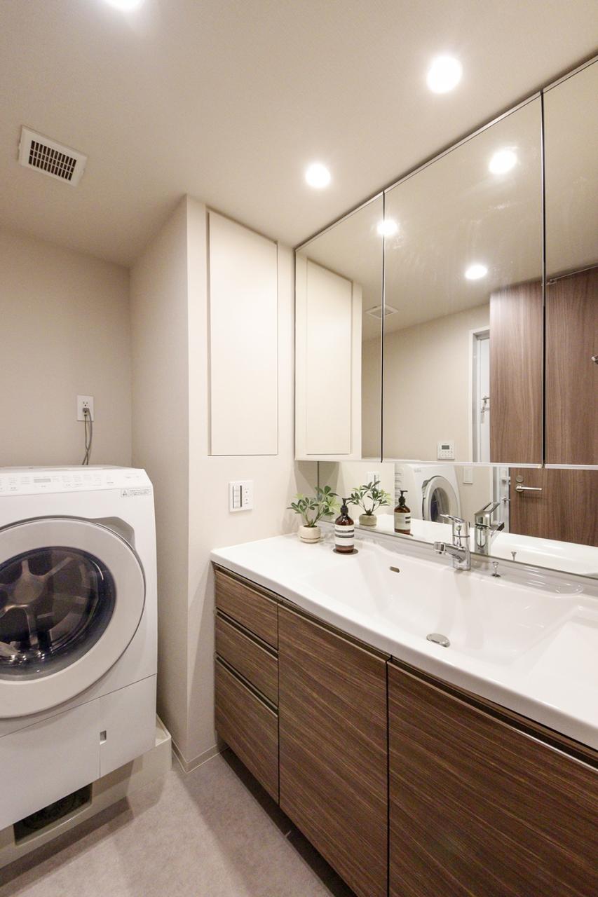 □三面鏡付きシャンプードレッサー□ 三面鏡の裏に収納空間を設け、家族一人一人の毎日の使い勝手にも配慮されたサニタリースペース。リネン棚収納も完備