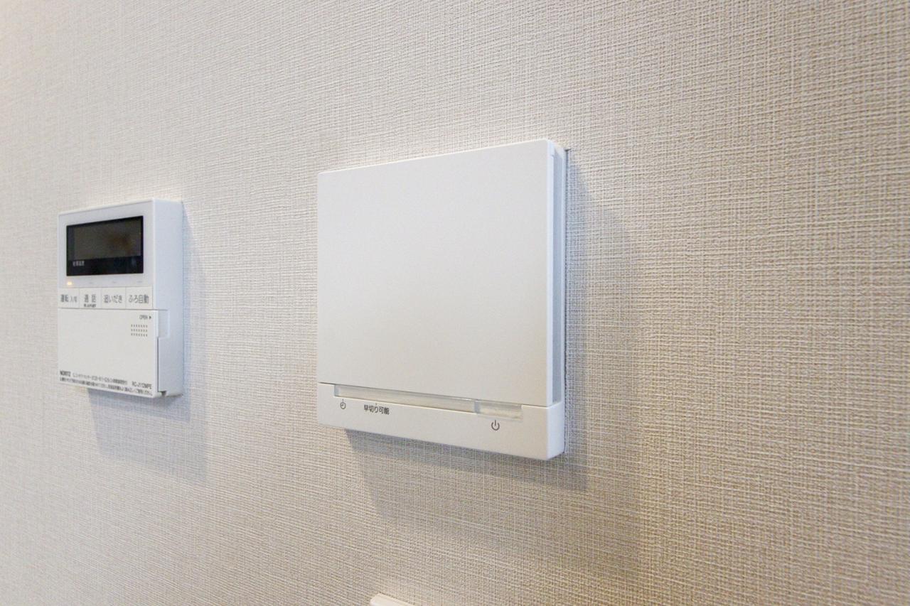 キッチンからスイッチで簡単操作可能な、オートバス機能付の給湯機パネル。経済的な追い焚き機能も備わります。おなじみのメロディで「お風呂が沸きました♪」と知らせてくれる優れものです