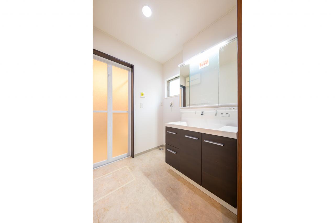 ■洗面脱衣室/三面鏡の裏に収納空間を設け、家族一人一人の毎日の使い勝手にも配慮されたサニタリースペース