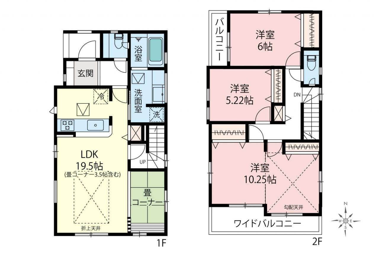 | 土地面積 | 117.90m2(35.66坪)~156.30m2(47.28坪) | 建物面積 | 105.36m2(31.87坪)~108.53m2(32.83坪) |