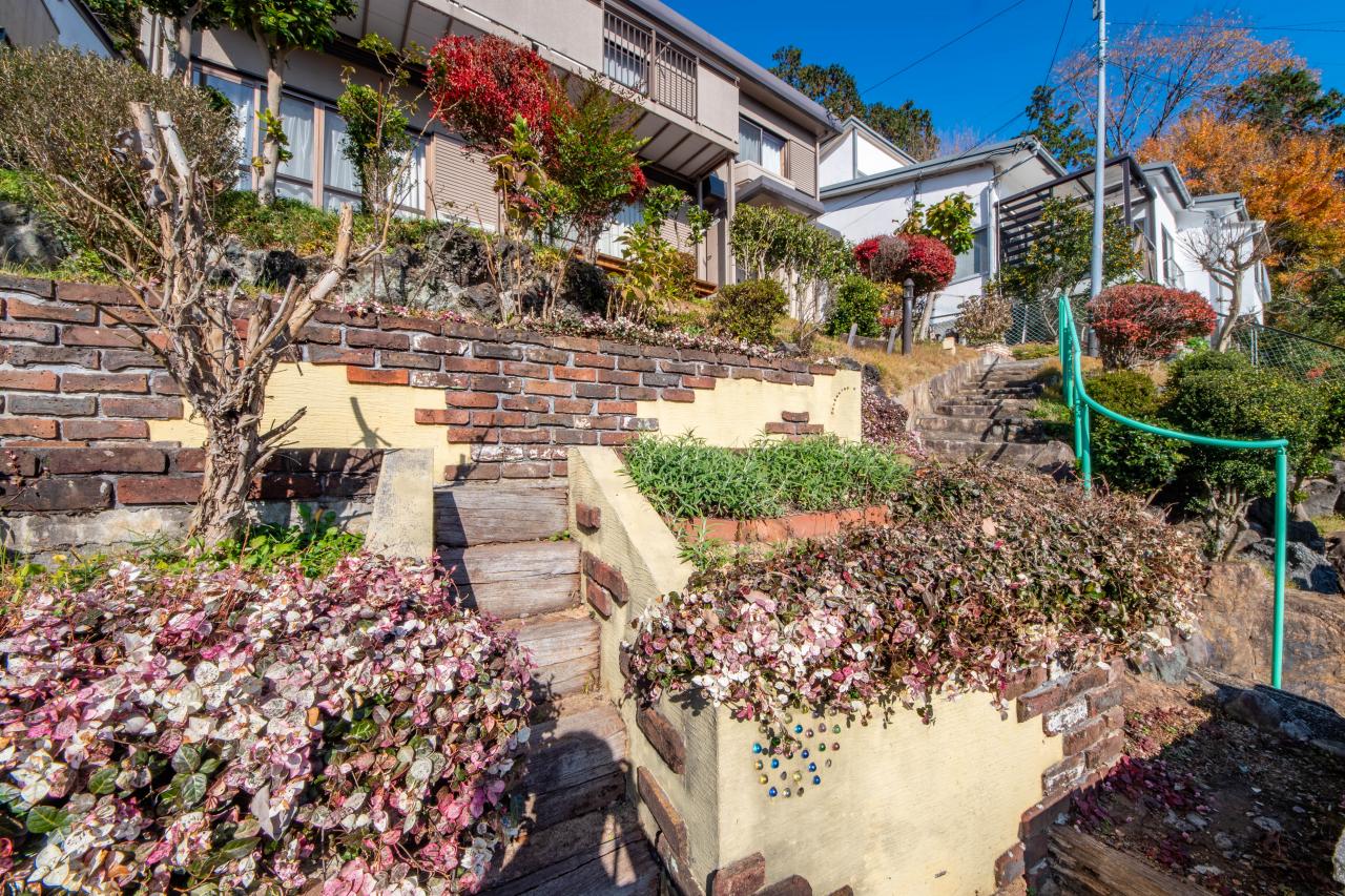 高台立地を活かし、玄関アプローチに豊かな庭園を実現。陽光に包まれるプライベートガーデン
