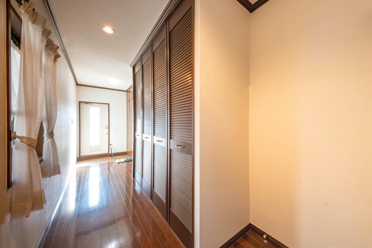 2階へ向かう階段手前には、大型の収納設備が備わります