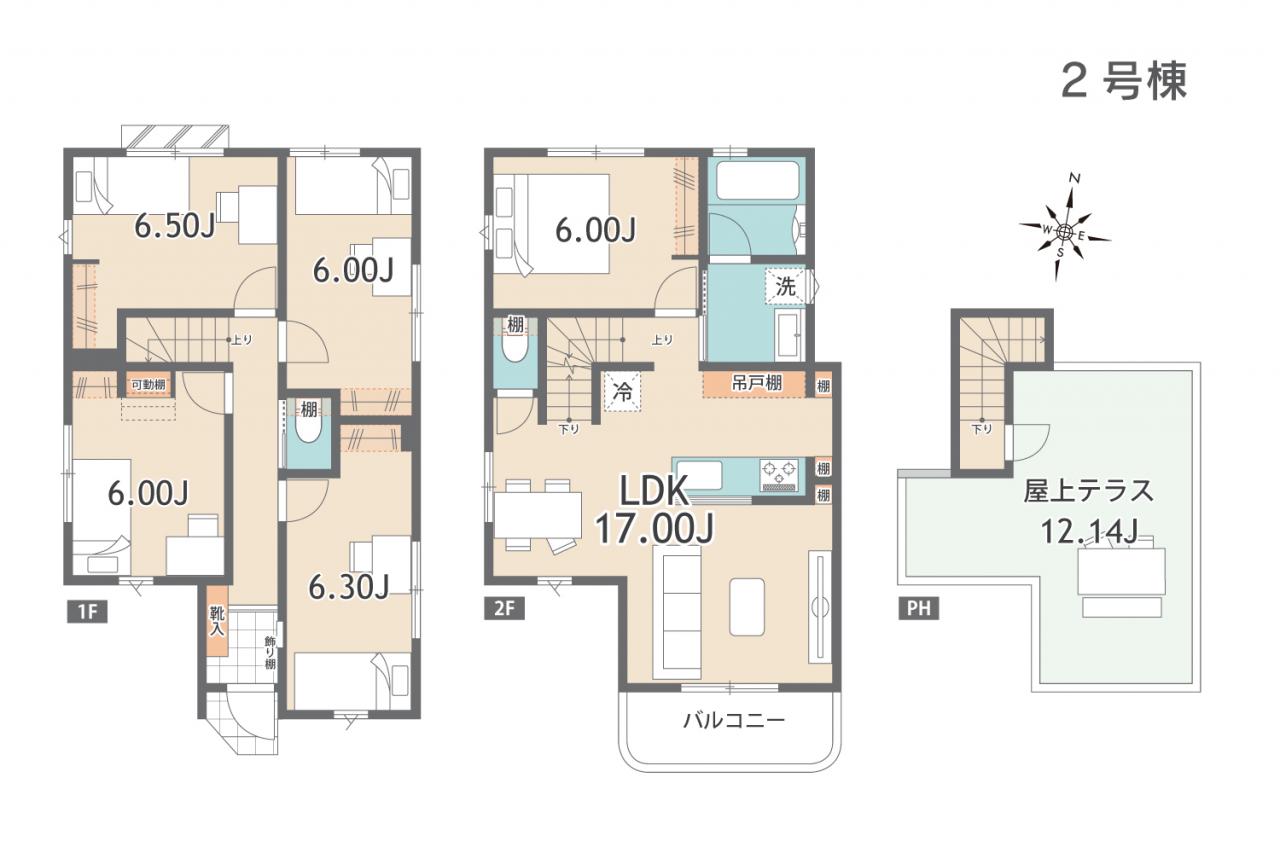 | 土地面積 | 84.42m2(25.53坪)~91.37m2(27.63坪) | 建物面積 | 95.76m2(28.96坪)~99.99m2(30.24坪) |