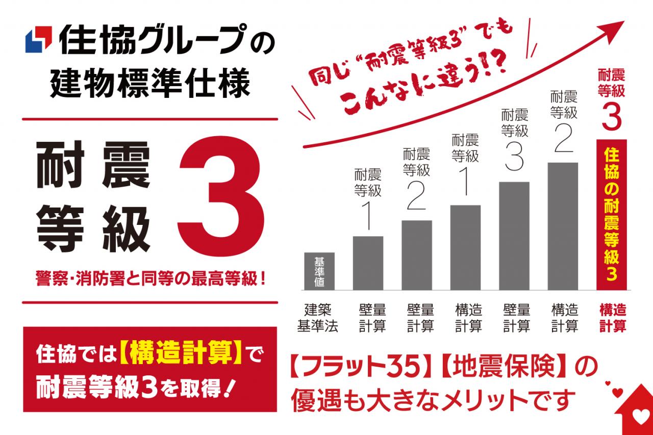 住協グループの耐震等級3は最も安全性の高い「構造計算」で取得しているからさらに安心!住まいの根幹に先進のテクノロジーを取り入れ、家族を地震から守る高耐久・高耐震の家づくり!
