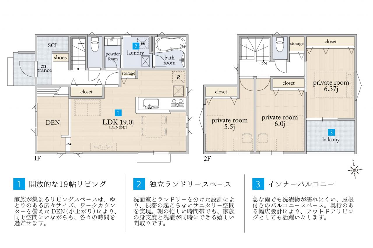 豊かに広がる19帖リビングには、マルチに活躍するDENスペースを造作。すべてのお部屋が南に面した、採光良好な間取りです