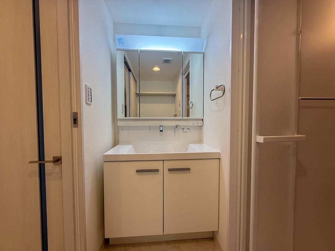■洗面化粧台/三面鏡の裏に収納空間を設け、家族一人一人の毎日の使い勝手にも配慮されたサニタリースペース