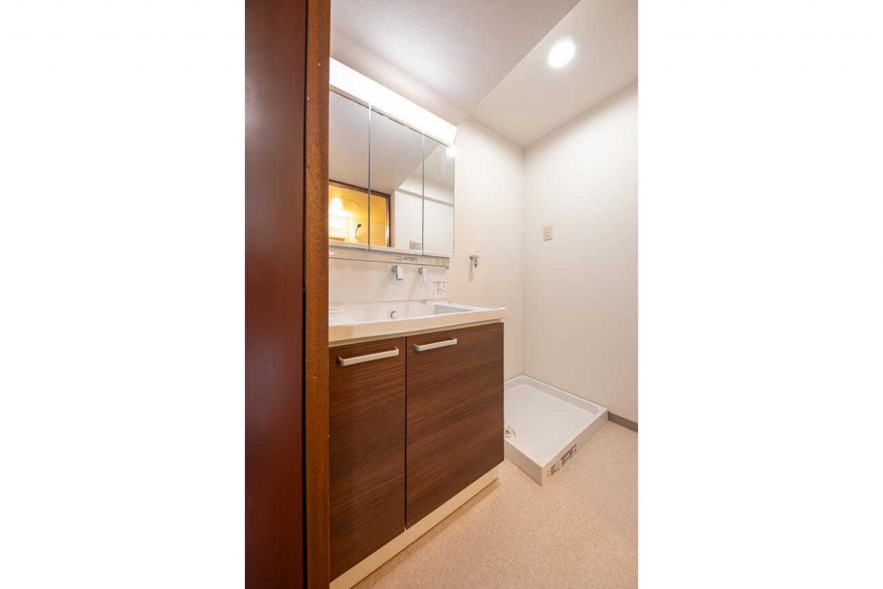 ■洗面化粧台/三面鏡の裏に収納空間を設け、家族一人一人の毎日の使い勝手にも配慮されたサニタリースペース