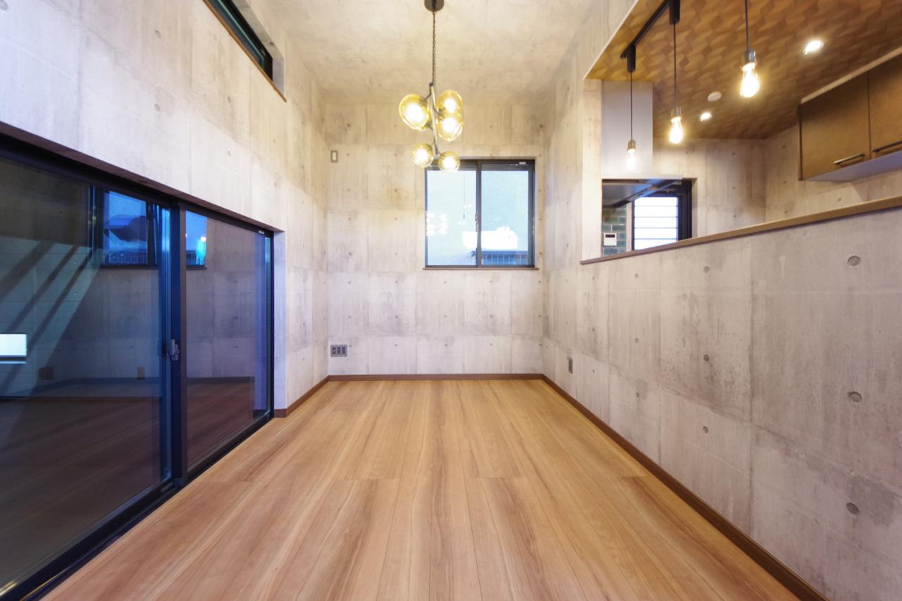 【DK】ブルックリンスタイル×ガレージビュー。愛車が映えるLDKリビングにいながら愛車を眺められる、ガレージと一体感のある間取りです。