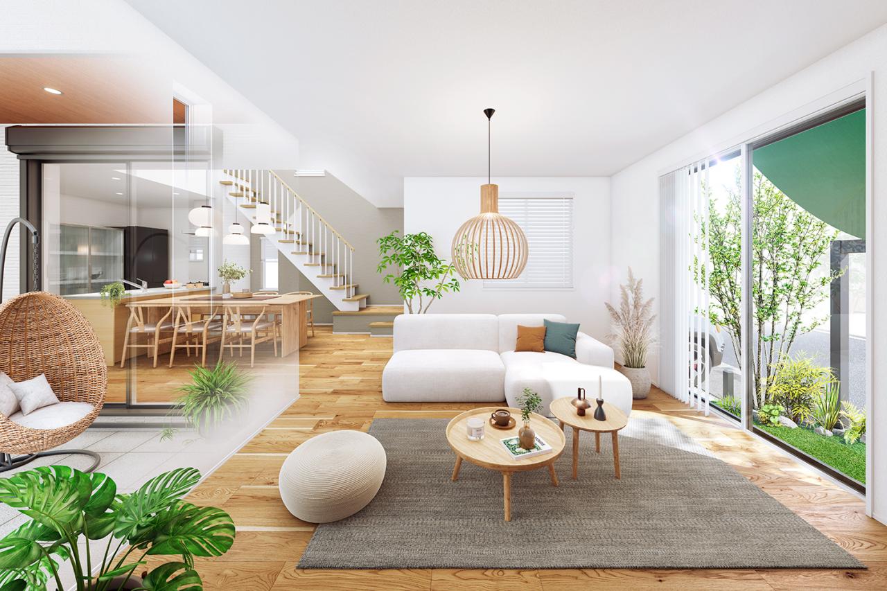 [21号棟]吹抜けのあるLDKにスケルトン階段を組み合わせ、光と開放感を演出。リビングとつながるテラス、シェードが内と外を心地よくつなぐ邸宅。