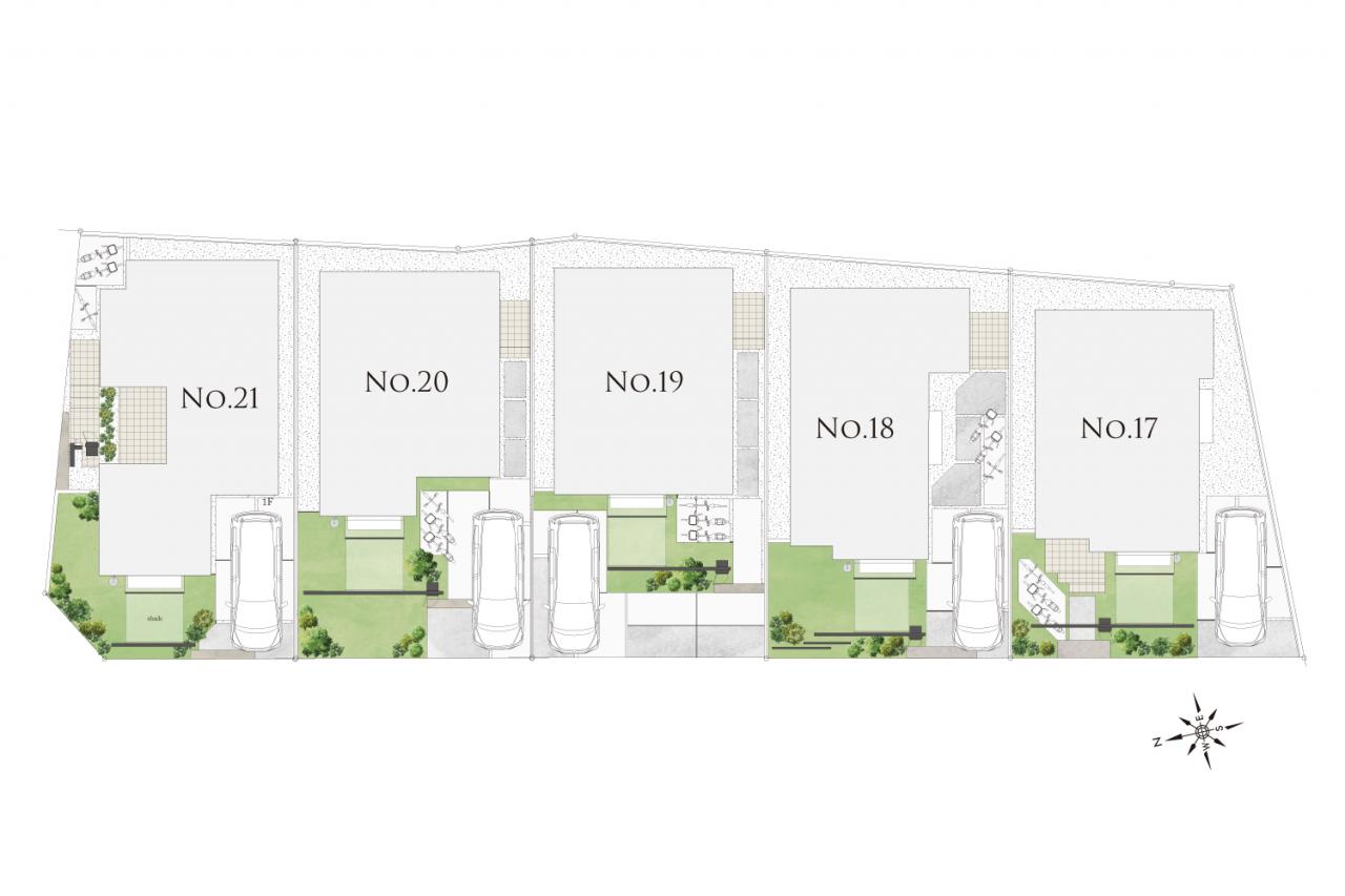 [区画図] フレームと豊かな植栽、5邸が連なり織りなす美しいファサード。接道幅員5M以上のゆとりある街並み。