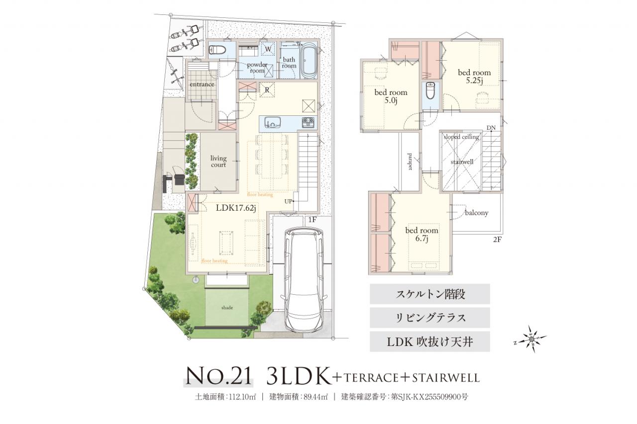 | 土地面積 | 112.10m2(33.91坪)~112.11m2(33.91坪) | 建物面積 | 89.02m2(26.92坪)~90.57m2(27.39坪) |