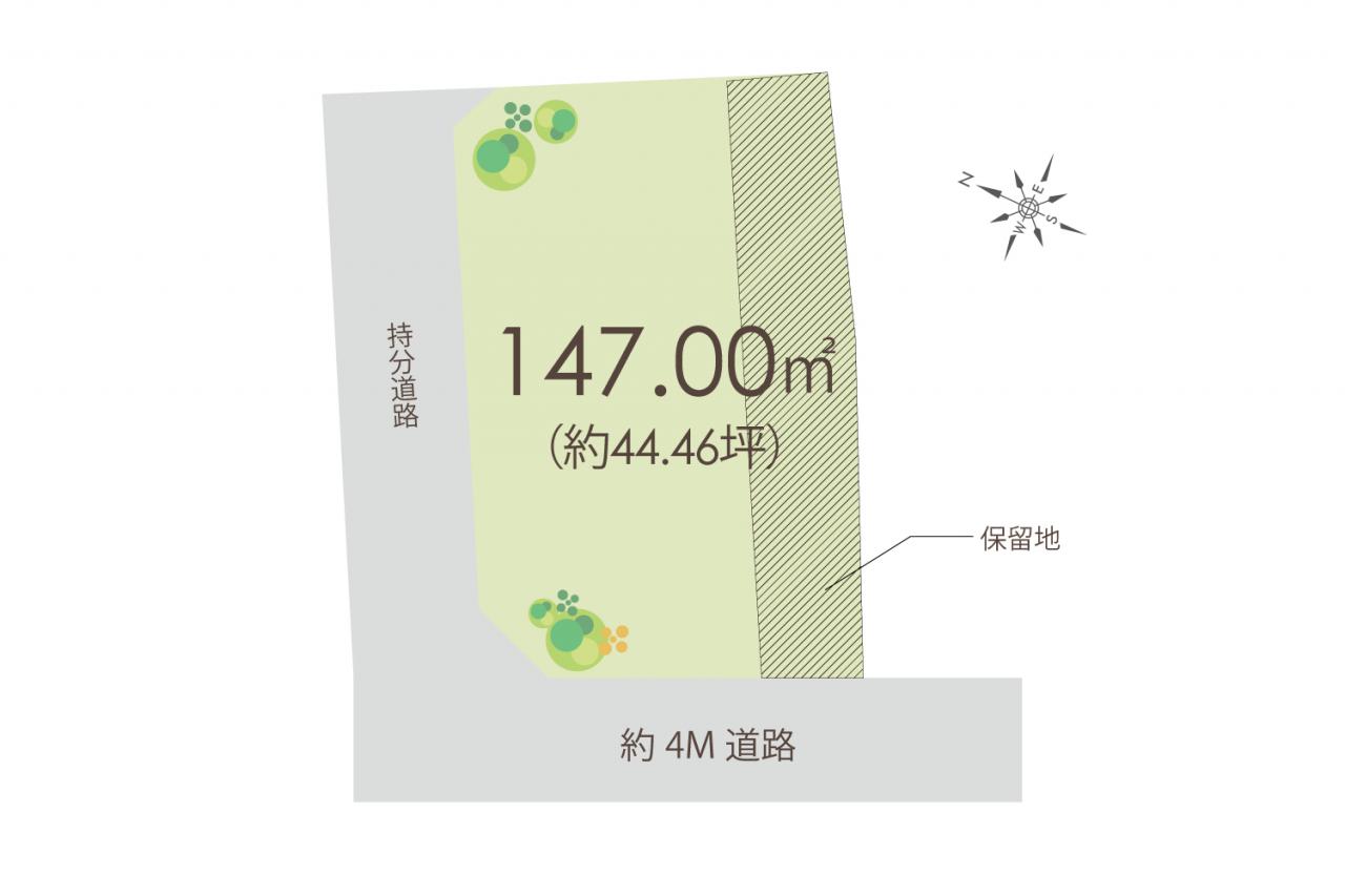 - ※建築条件付土地の販売は、売買契約後3ヶ月以内に売主との間で建築請負契約を結ぶことが条件となり、この期間内に建築請負契約が成立しない場合は、受領金を全額返済した上で土地売買契約は白紙となります。また、掲載されている参考プラン例は、土地販売において参考のための一例であり、採用するか否かは、購入者の自由です。