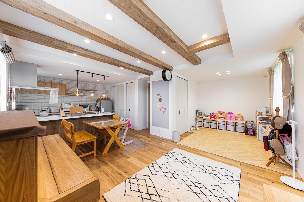 <リビング・住協建設施工例>木の梁が映える温もりあふれるLDK。キッチンから見渡せる開放的な空間で、家族の会話も子どもの笑顔も自然と広がる。暮らしやすさとデザイン性を両立した、毎日がもっと心地よくなる住まい。