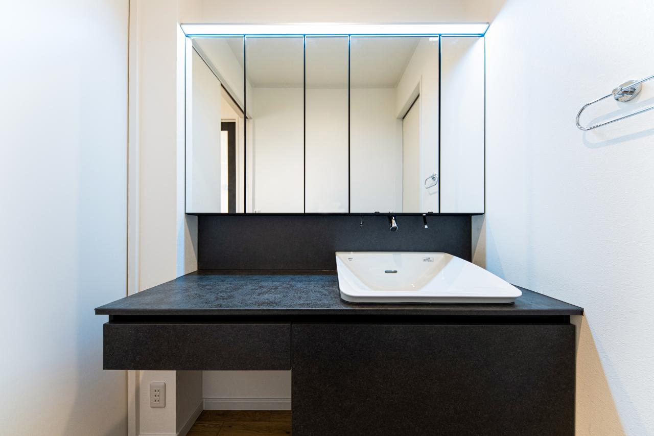 <洗面室・住協建設施工例>上質なブラックカウンターとミラーが広がりを生む、洗練された洗面空間。収納力とデザイン性を兼ね備え、朝の身支度も夜のリラックスタイムも心地よく整う、ホテルライクなひとときを叶えます。