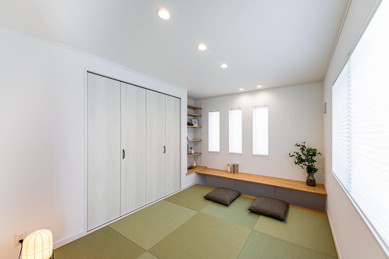 <和室・住協建設施工例>やわらかな畳の香りと、木のぬくもりに包まれる和モダン空間。造作カウンターで読書や在宅ワークも叶う、くつろぎと機能性を兼ね備えた一室。心を整える、穏やかな時間がここにあります。