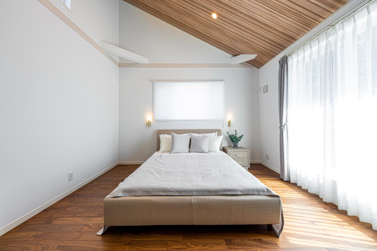 <居室・住協建設施工例>勾配天井に広がる美しい木目と、やわらかな自然光に包まれる主寝室。高い天井が生み出す開放感の中で、一日の疲れをゆったりと癒す贅沢な時間。心まで整う、上質で穏やかな眠りの空間です。