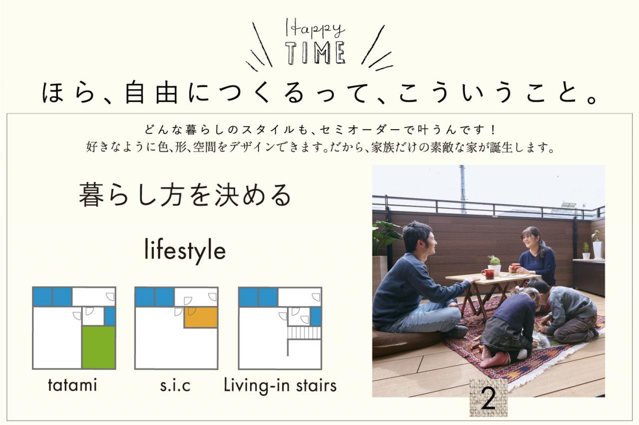 ご予算内で希望の間取・外観にできるセミオーダー住宅。敷地条件に合わせた基本の間取りプランをベースに、家族のライフスタイルやこだわり、将来性を考えてプランニング。内外装材、建具、設備などを自分たちの好みに合わせてセレクト、自在なコーディネートをおたのしみください!