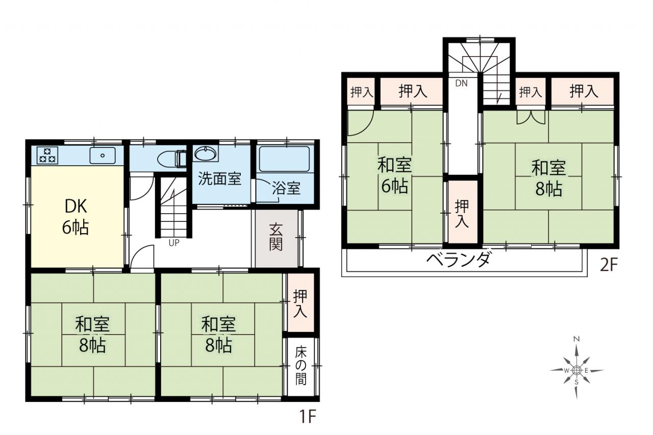| 設備 | 都市ガス / 公営水道 / 汚水:公共下水 閑静な住宅地 / 角地 / 整形地 / 平坦地 / 2階建 / 南向き / 全室南向き / 2面採光 / 全居室6畳以上 / 和室 / システムキッチン / 浴室に窓 / 室内洗濯機置場 / 洗濯機置場有 / バルコニー / 南面バルコニー / スーパー 徒歩10分以内 / 小学校まで1km以内 / 隣家との間隔が大きい / 公園 400m以内 / 隣家との間隔が広い / 都市ガス |