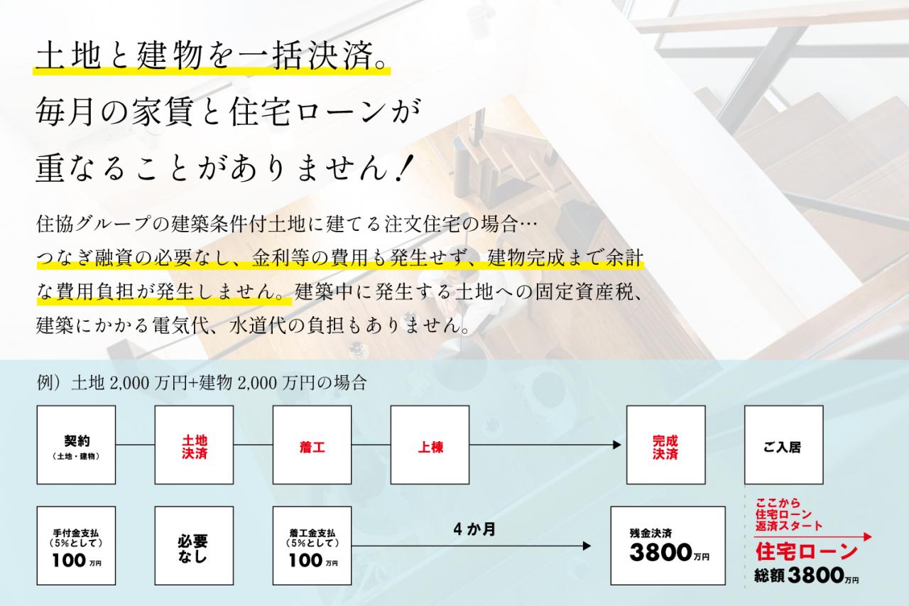 つなぎ融資不要で返済はお引渡し後から。余計な諸費用を抑え、無理のない家づくりをサポートします。