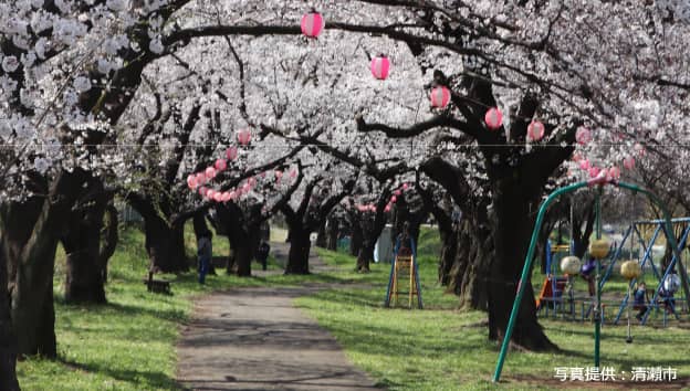 台田運動公園では柳瀬川の沿岸約1.3kmに桜が咲き、毎年見事なトンネルを作ります。満開の桜並木の下を歩けば、春ならではの絶景を楽しめます。その後桜の花びらが散り辺り一面がピンク色に染まる異世界を味わえるのも魅力のひとつです。