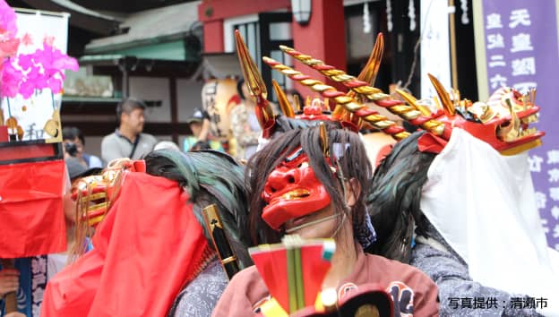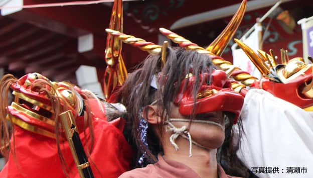 清瀬市の無形民俗文化財である「清戸の獅子舞」。獅子頭が清戸下宿に伝えられ、中清戸で五穀豊穣、厄除けの祭りになったといいます。現在では、日枝神社の神前を中心として舞が行われています。山の神が行列の先頭を舞いながら進み、女獅子・中獅子・大獅子が太鼓をたたきながら笛の音に合わせて力強い舞を繰り広げます。