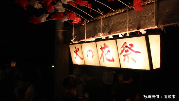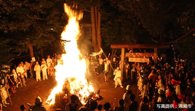 東京都無形民俗文化財の指定を受けた「中里の火の花祭」。中里富士山の頂上までの道のりには明かりが灯され、クライマックスには積み上げられた麦わらに火を付ける“お焚き上げ”が行われます。多くの人々が見守る中、炎は天高く舞い燃え盛ります。その灰を持ち帰り門口に撒くことで火災除けや魔除けに、畑に撒けば豊作になると伝えられており、今でも大切に灰を持ち帰る人がたくさんいます。