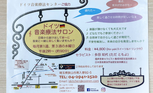 今行っているイベントの一つである、音楽療法は日本ではあまり浸透していなくて、先生がいて、ピアノ弾いて、みんなで歌ってというイメージが大きいみたいです。ドイツ音楽療法は音で自分を表現するものなんです。ドイツでは音楽療法は、医療としても使われているようです。音楽療法が昔から気になっていて、色々な国がそれぞれの療法を行っている中で、ドイツは何を行っているんだろうと気になって調べたところ、『ドイツ音楽療法センター』という施設が日本にあることを知りました。お話をお伺いしたところ、ご協力いただけることになり、ドイツ音楽療法を地域の方に紹介できるように色々試行錯誤しながら、センターの方と一緒に行っています。子育て中のお母さまや、若い男性の方など老若男女問わず色々な方に来ていただけるようなイベントにしたいと考えています。やはり一人で悩むのが一番苦しいと思うので、ただのパン屋ではあるのですが、集いの場として皆さんに親しんでいただけるようにしたいと考えています。音楽ができないとだめということもないので、少しでも気になる方がいたら気軽に来てくださると嬉しいです。