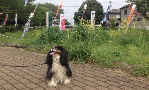 不老川沿いでスパイクとこどもの日を祝った際のお写真(狭山市)