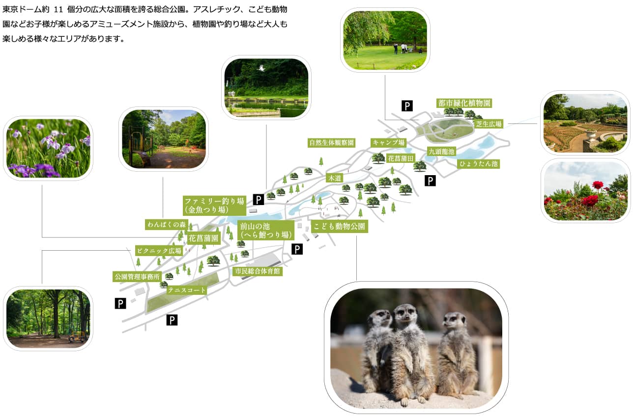 東京ドーム約11個分の広大な面積を誇る総合公園。アスレチック、こども動物園などお子様が楽しめるアミューズメント施設から、植物園や釣り場など大人も楽しめる様々なエリアがあります。